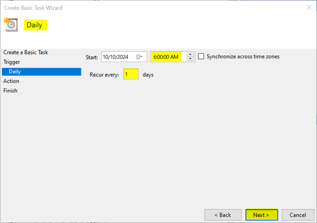 Select a Start Time that you do not expect to actively be working on the files you plan to backup to reduce chances of copy errors from files that are in active use. I personally choose 6:00 AM so that it’s early enough in the morning to not cross over with my active hours. Set to recur every 1 day(s) and click Next >.