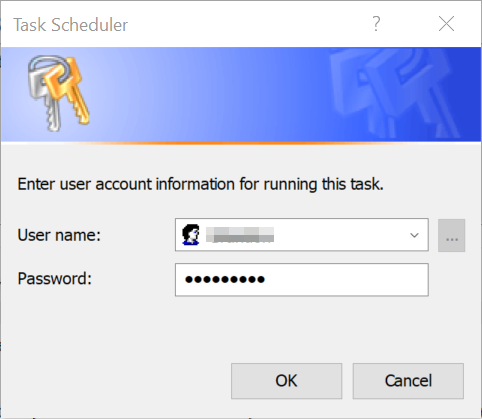 9. You may be prompted with your computer’s user name and password to save this task to run going forward. Enter your PC’s user and password* and then click OK.