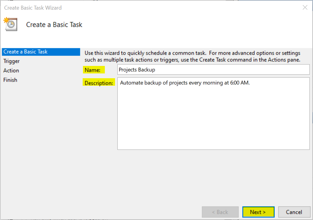 3. Create a Name and optionally provide a Description of your task, then click Next >.
