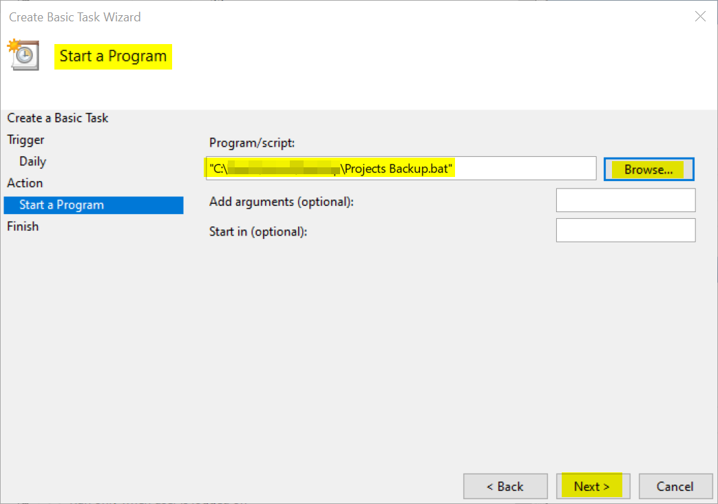 Browse to wherever you saved your .bat batch file after creating your ROBOCOPY script, then select your .bat file as your Program/script. Finally click Next >.