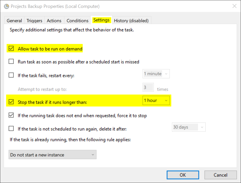 8. On the Settings tab, make sure boxes are checked for “Allow task to be run on demand” and “Stop the task if it runs longer than:”. This script should be very fast, I set it to the minimum to stop the task if it runs longer than 1 hour, then click OK to save changes.