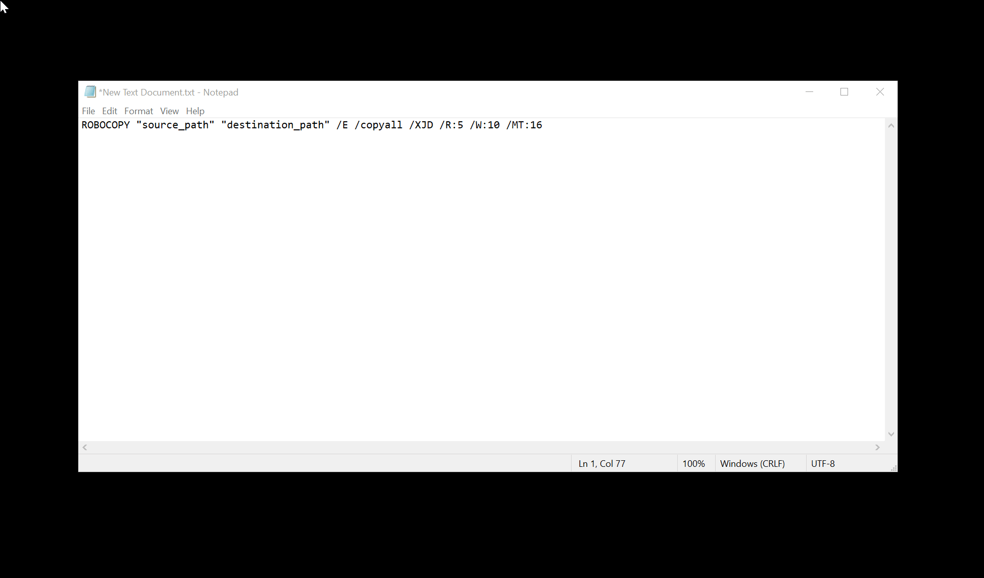 Copy and paste the above ROBOCOPY code into Notepad, and change out source_path and destination_path leaving the quotation marks in place.