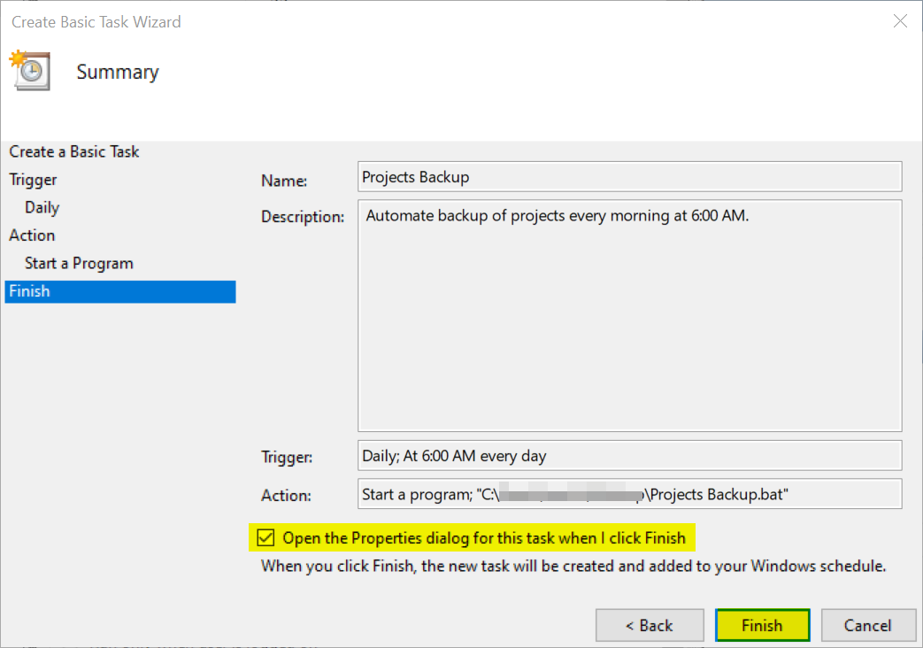 6. On the Finish page, check the “Open the Properties dialog for this task when I click Finish” box and click Finish.