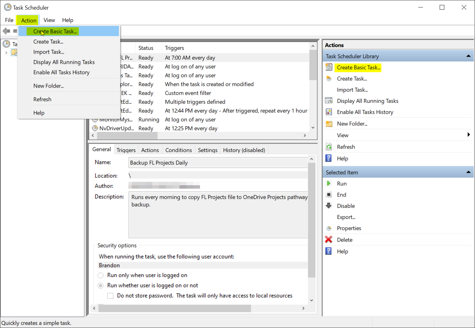 Luckily, these aren’t too hard to rebuild out, but make a backup copy of your batch file and save that to the cloud. You can even export a Task Scheduler task as an .xml file to import onto another machine to quickly rebuild tasks (just make sure your .bat script path is referenced correctly if rebuilding).