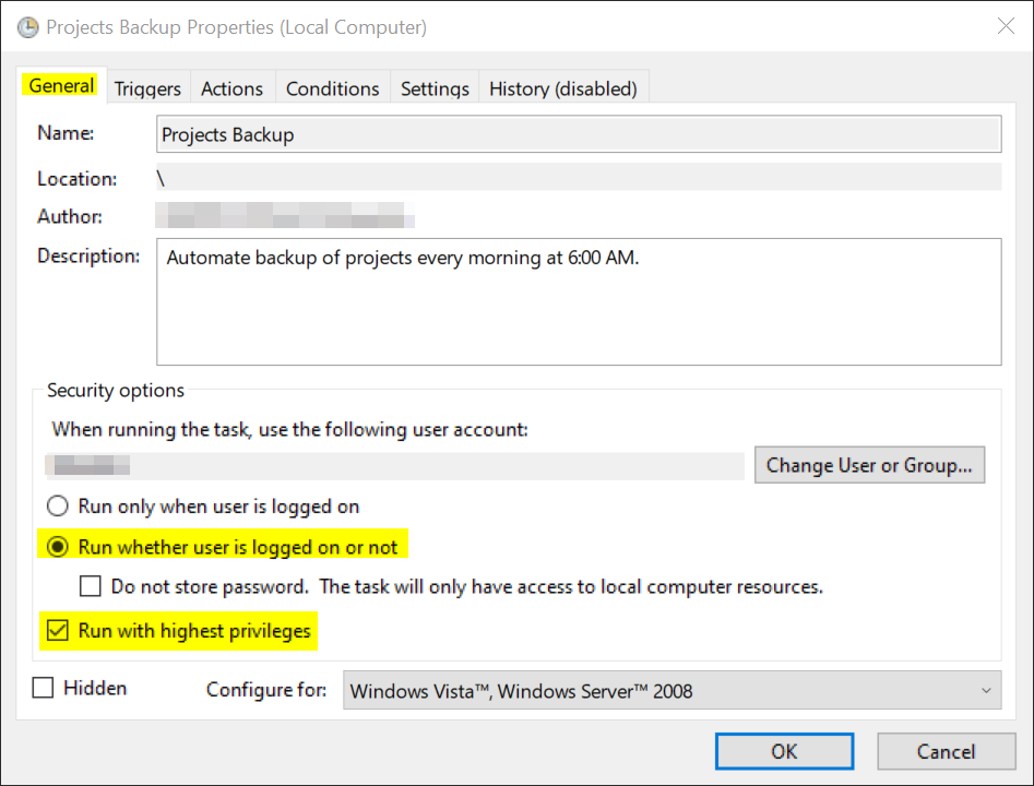 7. On the General tab, change Security Options to “Run whether user is logged on or not” and check the box to “Run with highest privileges”.