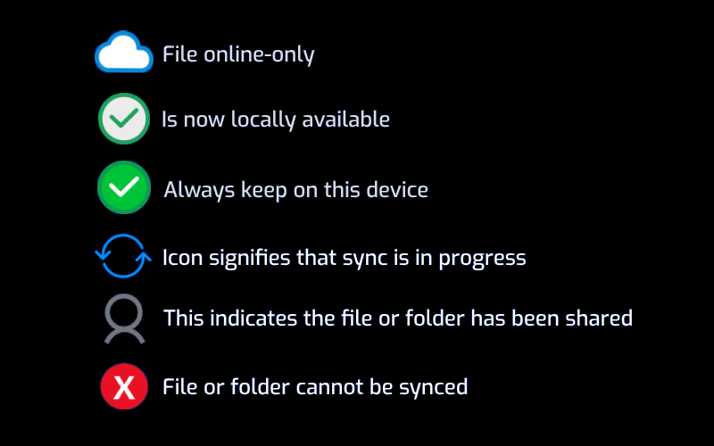 By default, OneDrive keeps files stored locally, and synced to the cloud. These files display a green checkmark with a white background, indicating they are fully available on the device and backed up online.